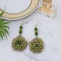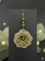 Cada peça é cuidadosamente confeccionada com fio de viscose acetinada, que possui brilho suave semelhante ao da seda, criando uma textura elegante e aconchegante ao mesmo tempo. As miçangas em tom verde oliva trazem contraste, profundidade e um toque orgânico que remete à natureza, ao equilíbrio e à feminilidade madura.