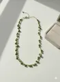 Confeccionado manualmente com fio de viscose acetinada, de brilho suave e toque delicado, o colar ganha vida com miçangas em tom verde oliva, distribuídas de forma fluida, criando movimento, textura e um visual naturalmente elegante. Cada detalhe evoca calma, equilíbrio e conexão com o essencial.