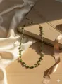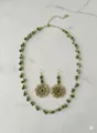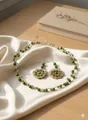 Cada peça é cuidadosamente feita à mão, utilizando fio de viscose acetinada, com brilho suave semelhante ao da seda, e miçangas em tom verde oliva, que evocam natureza, equilíbrio e frescor. O resultado é um conjunto orgânico, sofisticado e atemporal — discreto na forma, marcante na presença.